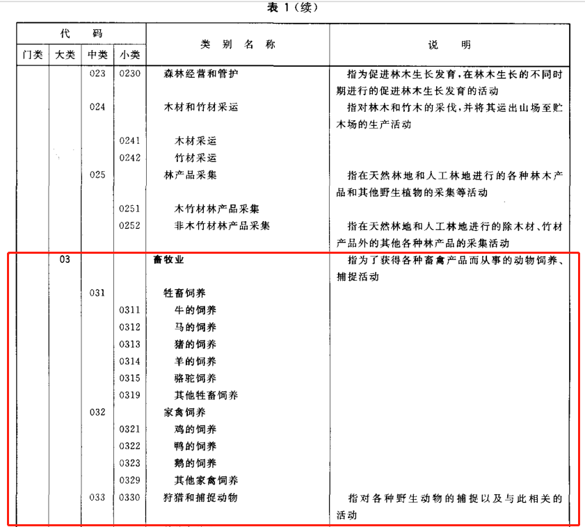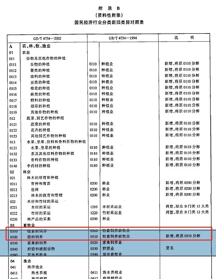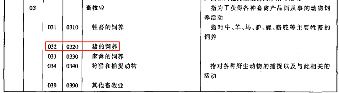 其实,更早之前的GB/T4754-1994(被GB/T4754-2002替代)中,是没有“猪的饲养”这一小类的,就是0310“牲畜饲养放牧业”,是GB/T4754-2002将0310小类分解新增。