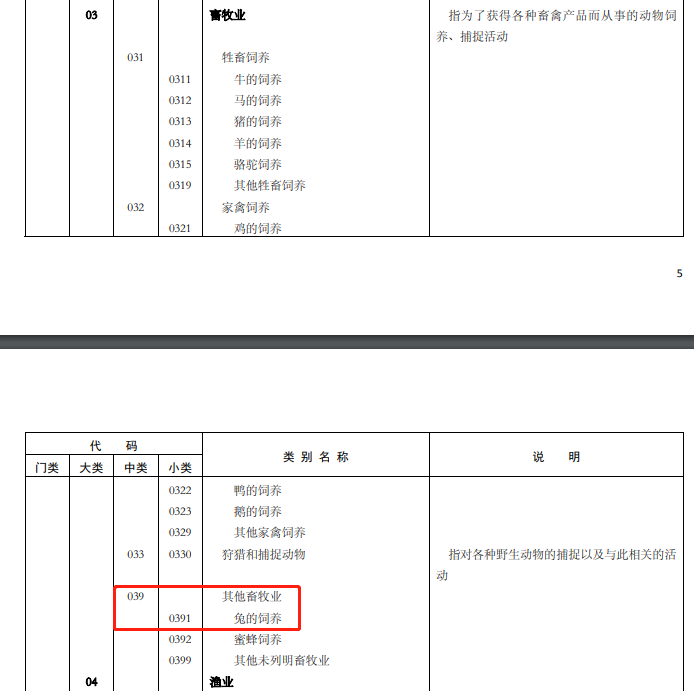 2017年10月1日施行的GB/T4754-2017(替代GB/T4754-2011),也是如此列示,并且,把公告中“兔的饲养”列入0391“其他畜牧业 兔的饲养”