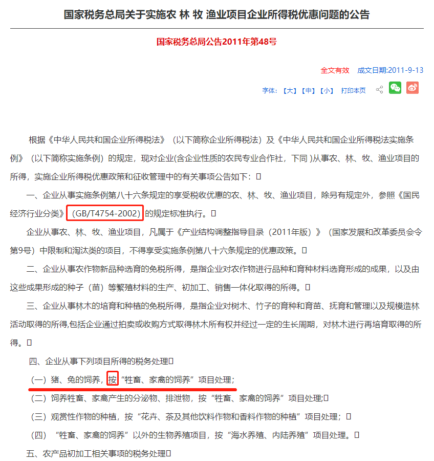 其实呢,上述公告文件是落实《中华人民共和国企业所得税法》《中华人民共和国企业所得税法实施条例》的。公告说“企业从事实施条例第八十六条规定的享受税收优惠的农、林、牧、渔业项目,除另有规定外,参照《国民经济行业分类》(GB/T4754-2002)的规定标准执行”。